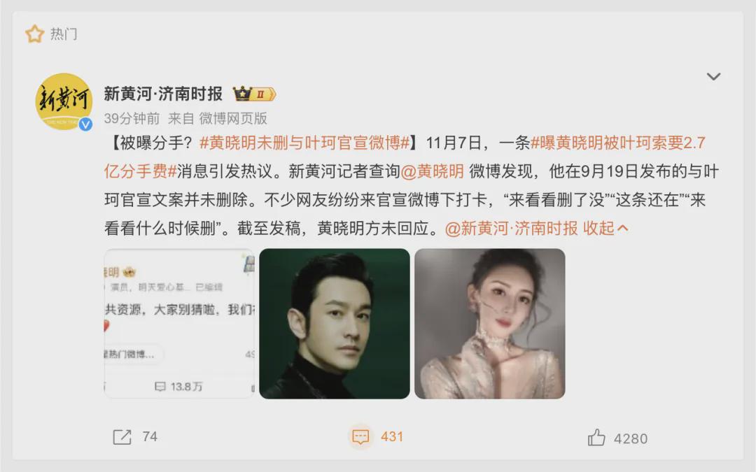 相关曝料称,两人不仅被曝分手,而且叶珂索要2.7亿分手费。