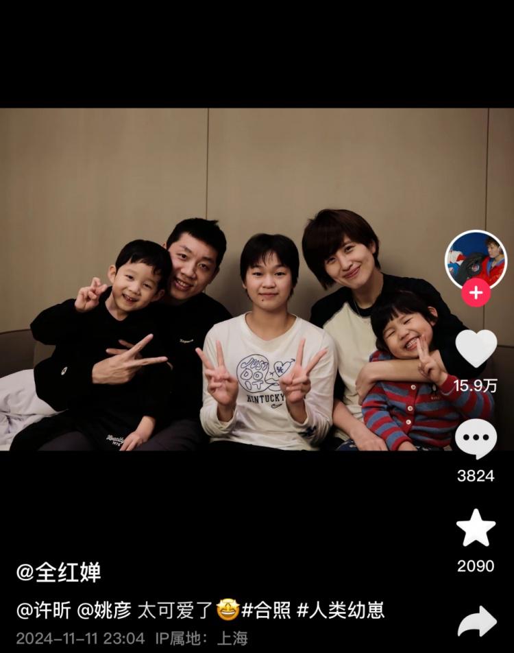 全红婵晒出她与许昕一家子的合影并为许昕家的俩娃配文写道:“太可爱了。”