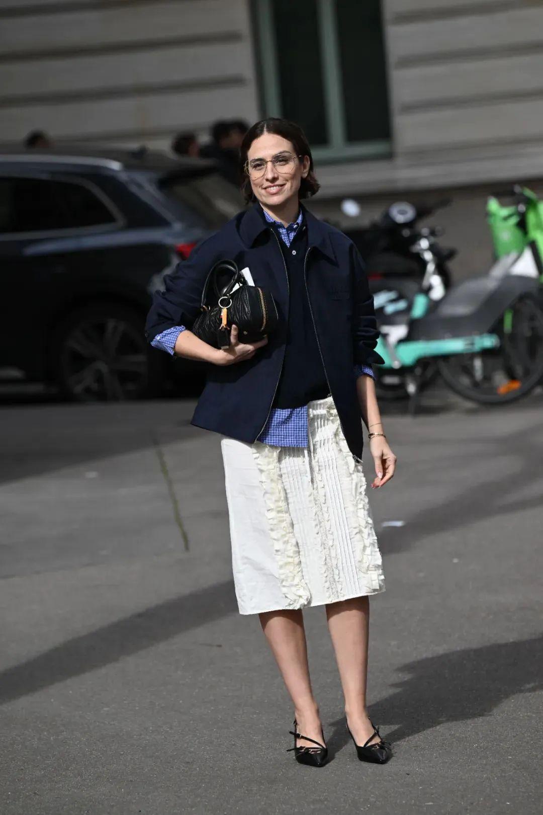 当然“下身失踪”也是穿夹克时不容错过的穿搭法则,工装夹克宽大的版型给了下衣失踪得天独厚的条件,长裙或紧身裤短款都可以使夹克的硬朗感柔和化。与长裙的搭配则是更为柔美的呈现方式,轻松在优雅和率性之中找到平衡。