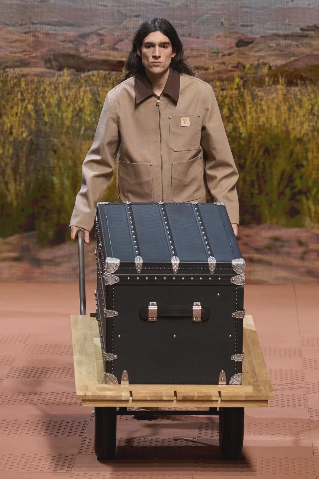 在路易威登2024的秋冬的秀场上,模特们直接推着硬板车打工,夹克上经典的口袋方块标识上也印上了LV的品牌符号,完美诠释了贵版Carhartt。