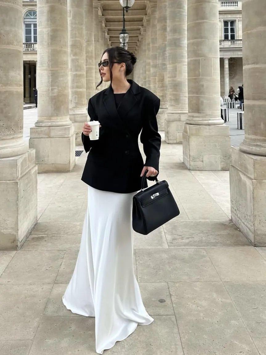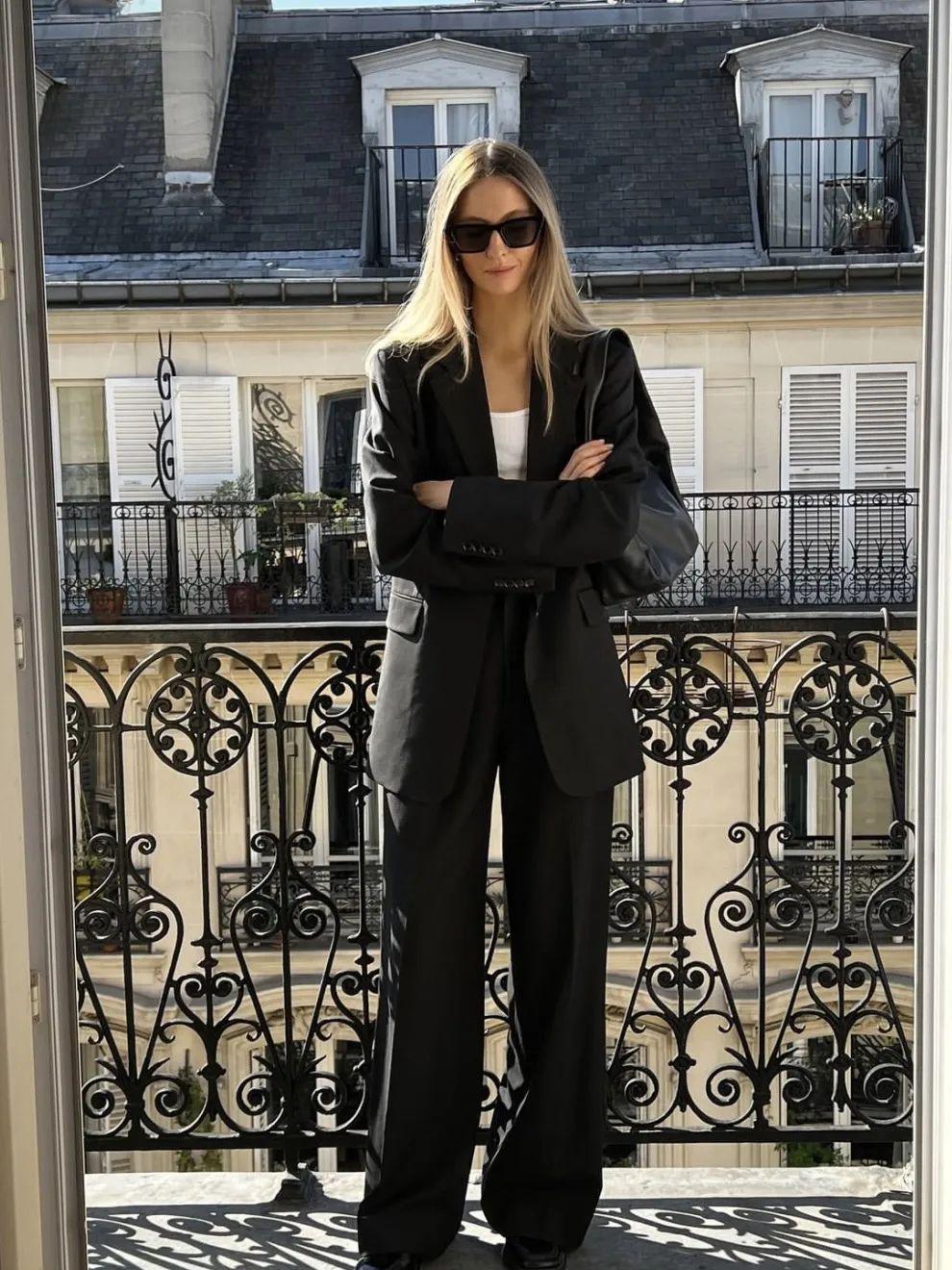 或是比较常见的就是加入白衬衫,利落的衬衫领,会给一身黑增加一份女绅士感。
