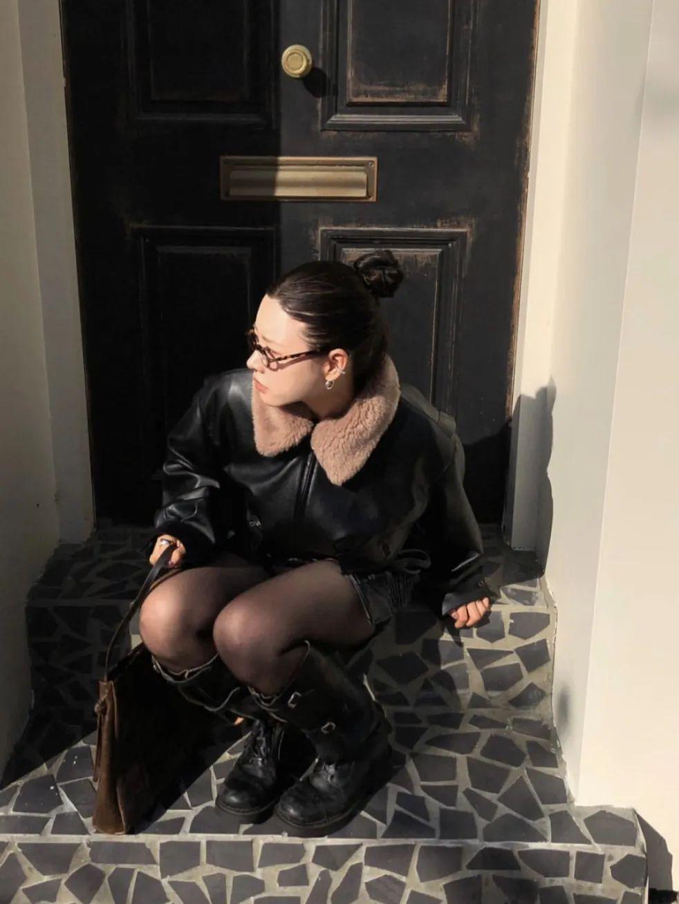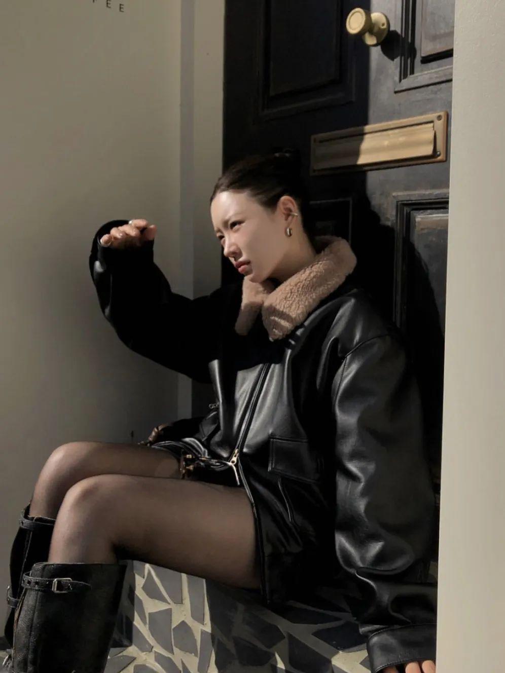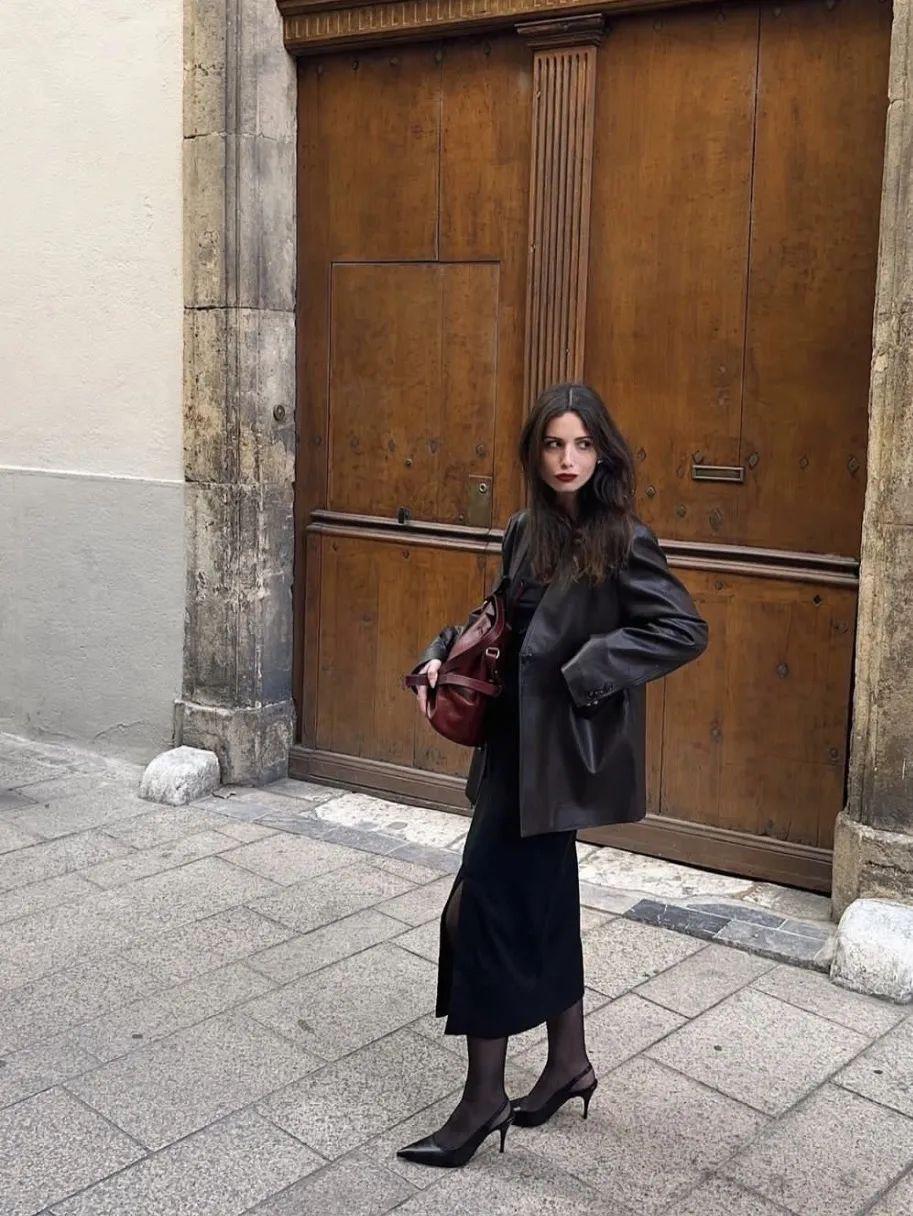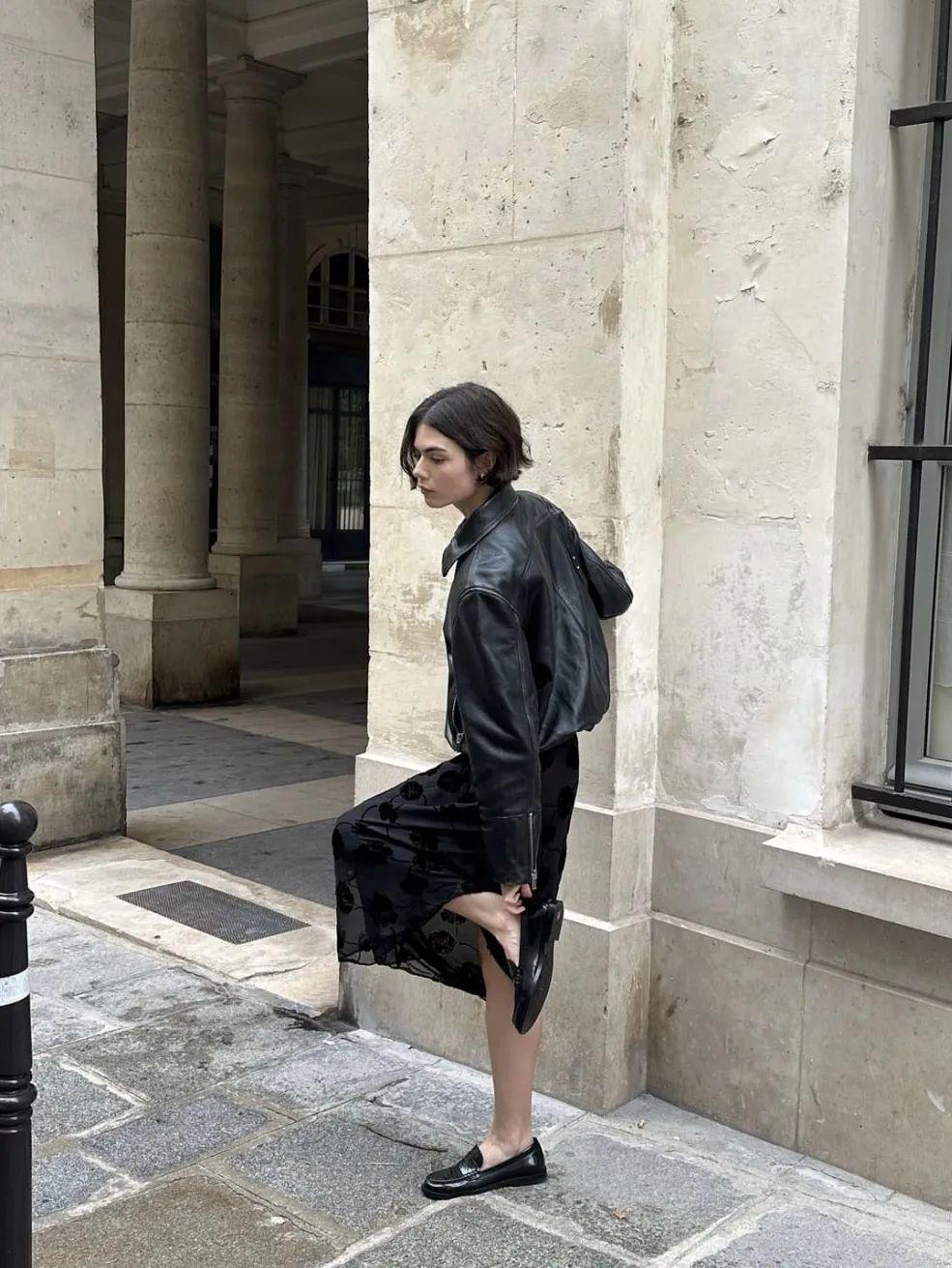 类似黑色皮夹克搭配黑色半裙,脚下一双黑色尖头鞋,这样的组合在秋冬街头轻松成为众人瞩目的中心,透露出一种低调而不失个性的时尚气息。