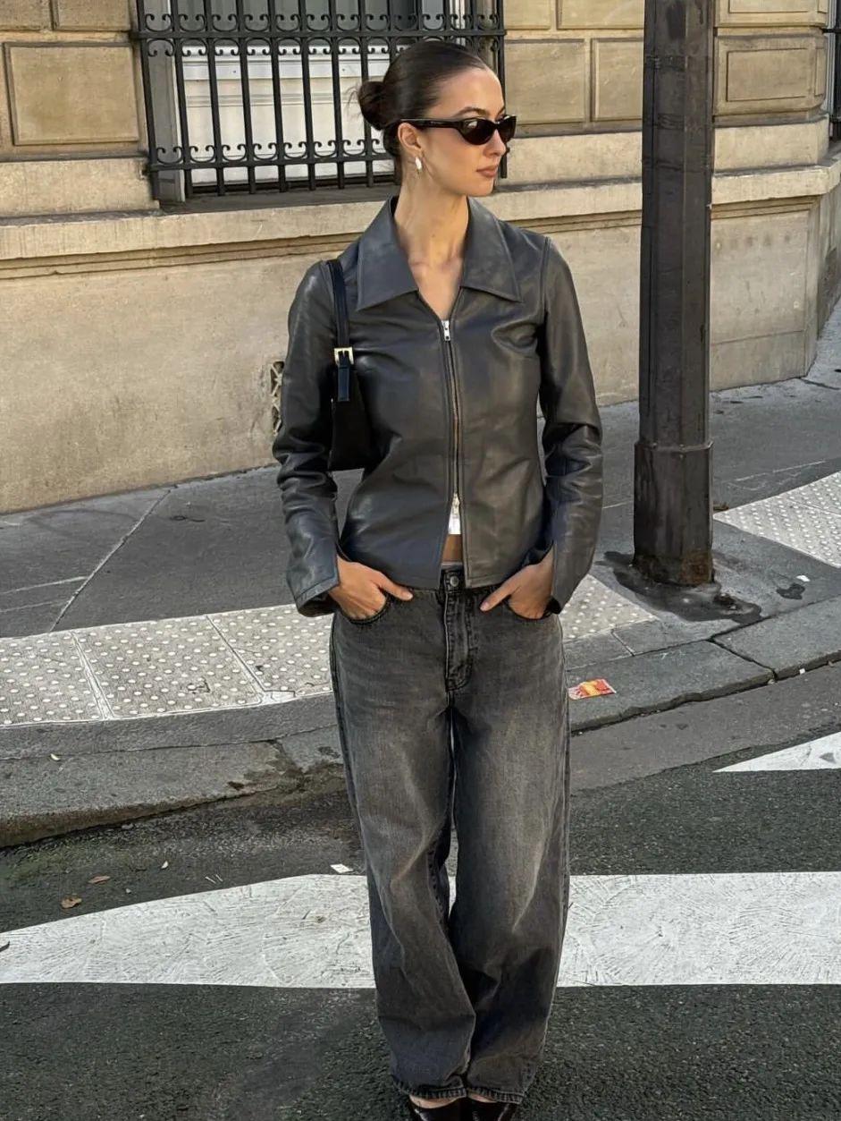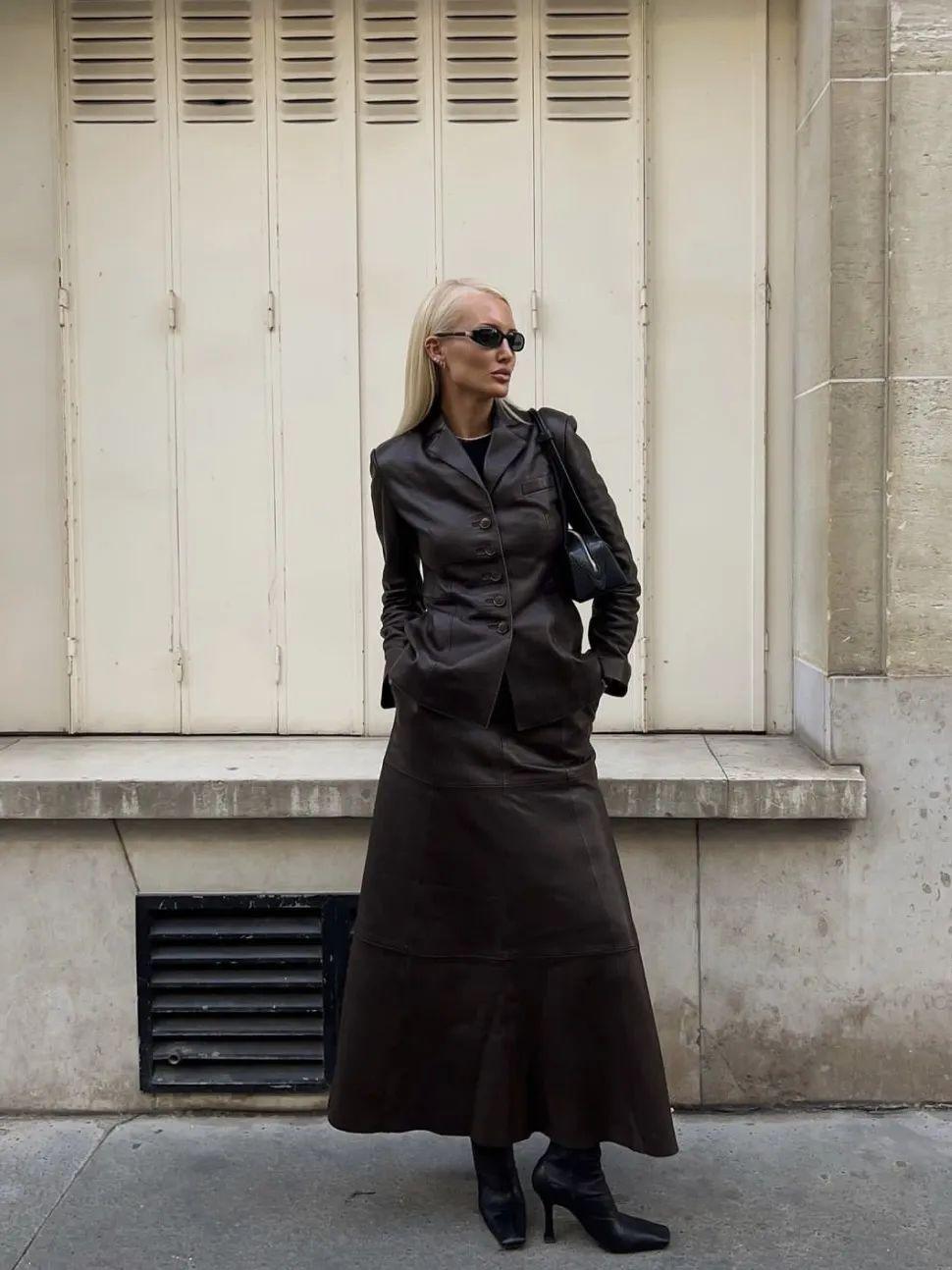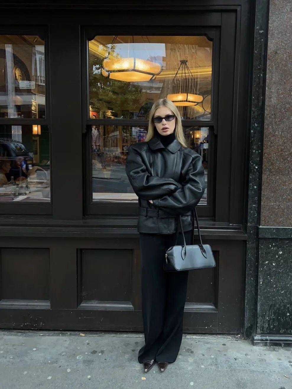 类似黑色皮夹克搭配黑色半裙,脚下一双黑色尖头鞋,这样的组合在秋冬街头轻松成为众人瞩目的中心,透露出一种低调而不失个性的时尚气息。