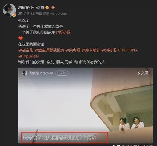 周放不止在社交平台公布了喜讯,更分享了自己的爱情故事,连名字都透露着纯爱与甜蜜:《我嫁给了幼儿园隔壁班的那个男孩》。
