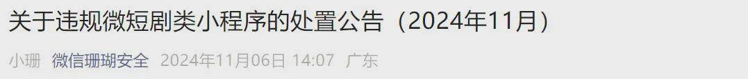 此前,微信珊瑚安全账号也发布公告称,近期,平台通过巡查审核发现,部分微短剧类小程序存在未进行剧目合规备案、不良导向价值观内容或存在侵权等行为。根据国家相关法律法规要求以及《腾讯微信软件许可服务协议》《微信小程序运营规范》的相关规定,平台下架了部分违规微短剧剧目,并对相关违规小程序进行处置。