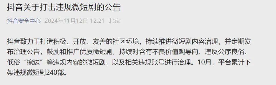 《抖音关于打击违规微短剧的公告》