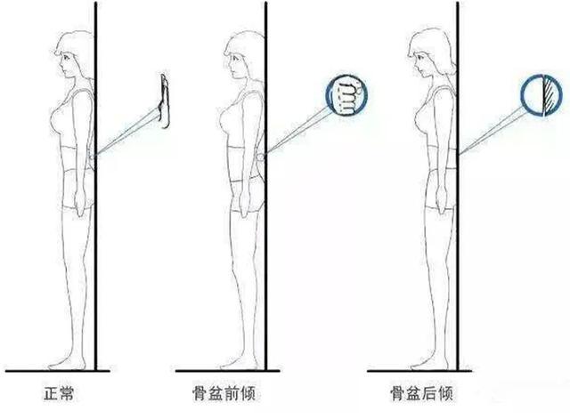 身体靠墙紧贴,用手掌、拳头检测腰椎和墙壁之间的距离,如果手掌穿越不过去腰之间那就是正常,如果手掌拳头能轻易穿越过去就存在骨盆前倾的问题。