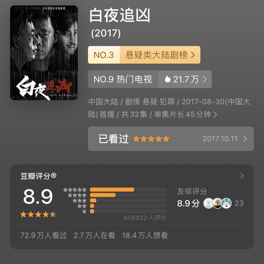 2017年,悬疑题材网剧《白夜追凶》因快节奏、强逻辑和内敛克制的叙事风格,成为当年的黑马。剧集上线16小时,全网播放量破亿,最终以超过40亿的播放量收官,时至今日仍保持着8.9的豆瓣高分。此外,《白夜追凶》还被奈飞买下海外发行权,成为国内第一部正式在海外大范围播出的网络剧集。