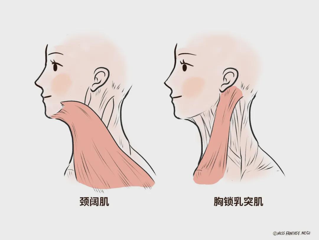 其实我们在以前也有讲过,下颌线清不清晰,和颈阔肌、胸锁乳突肌的状态有很大关系。▼