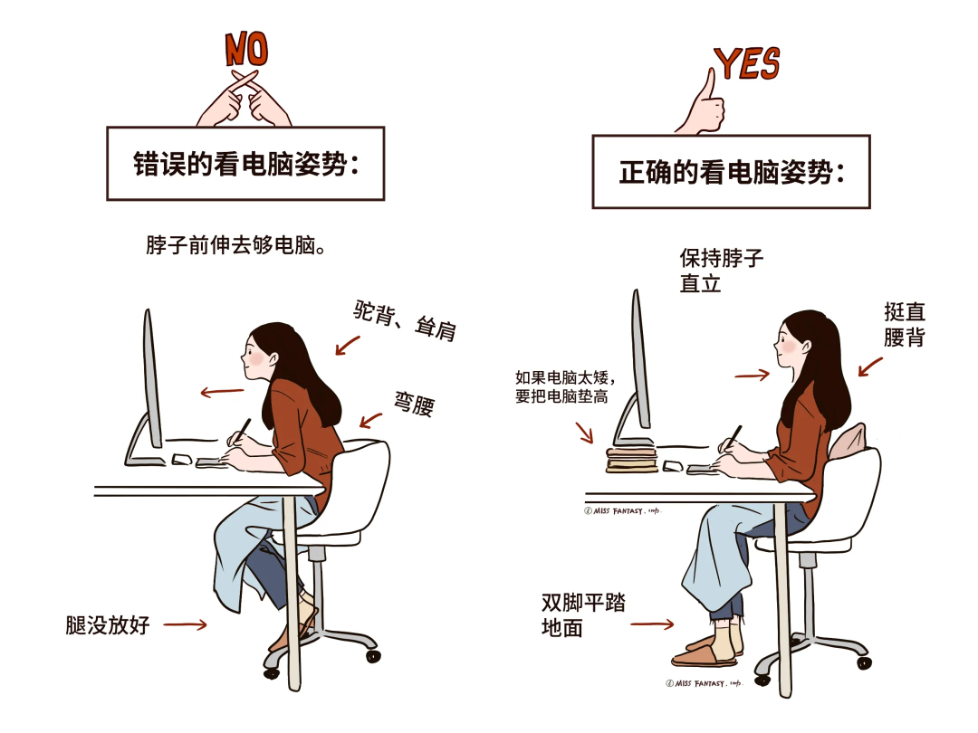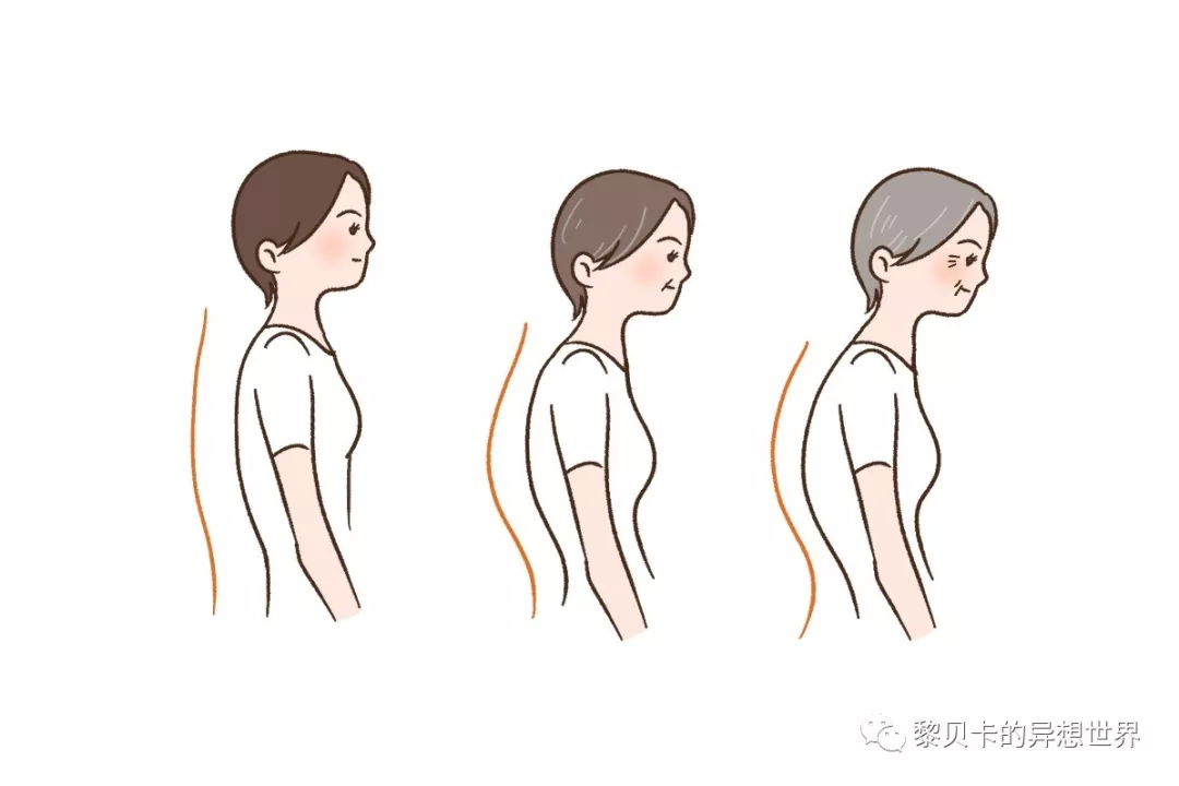 先请驼背圆肩的小伙伴想想自己平时工作的状态:是不是脖子离屏幕原来越近(脖子前倾),身体重心往前移,慢慢就变成了“虾米”状(弯腰驼背)。▼