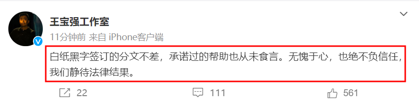 11月21日晚8点多,王宝强工作室发文:白纸黑字签订的分文不差,承诺过的帮助也从未食言。无愧于心,也绝不负信任,我们静待法律结果。