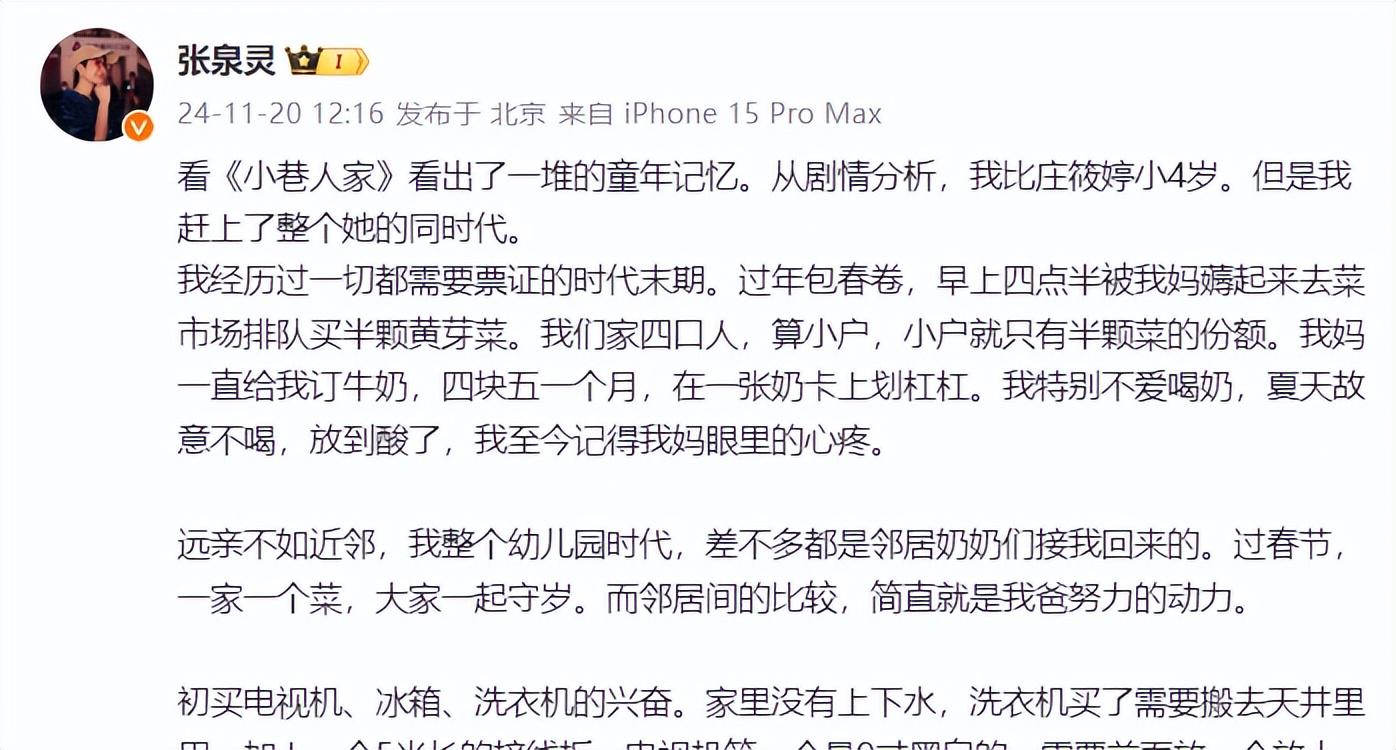 “看《小巷人家》看出了一堆的童年记忆。从剧情分析,我比庄筱婷小4岁。但是我赶上了整个她的同时代。我经历过一切都需要票证的时代末期。过年包春卷,早上四点半被我妈薅起来去菜市场排队买半颗黄芽菜。我们家四口人,算小户,小户就只有半棵菜的份额。我妈一直给我订牛奶,四块五一个月,在一张奶卡上划杠杠。我特别不爱喝奶,夏天故意不喝,放到酸了,我至今记得我妈眼里的心疼。”文章一开始,张泉灵就把自己带入到那个年代。