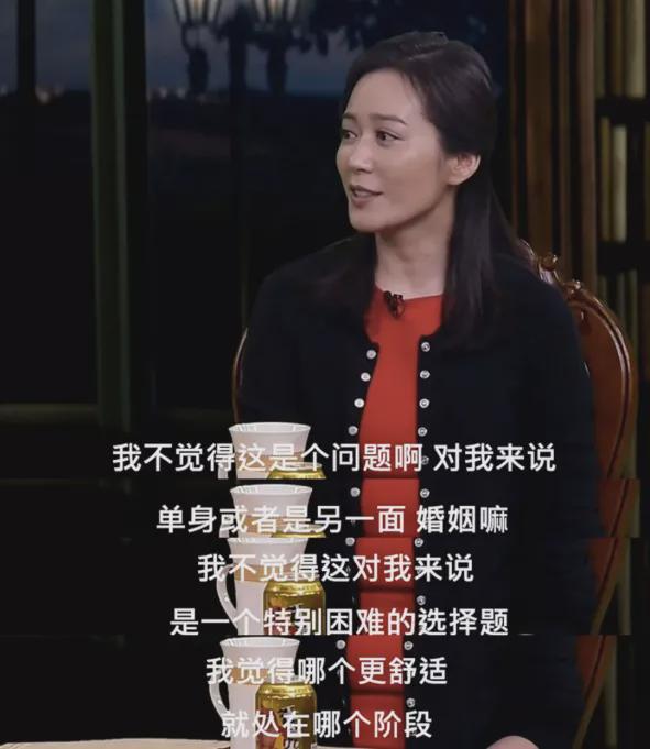在她看来,单身从来不是个问题。她坦言自己不是独身主义,也不是不婚主义,只是哪一种状态舒服,她就待在哪个阶段。