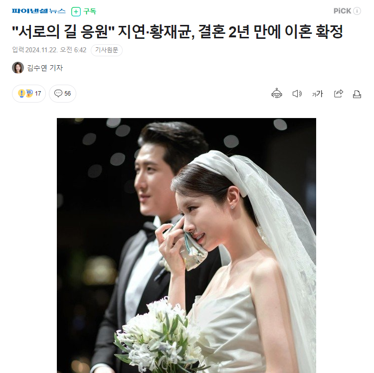 对此,韩国网友们表示:“这段时间两个人都辛苦了,离婚是他们的私事,希望大家就不要深究原因了”、“好像只过了一年多,那么也没什么共同财产可以分割的吧”、“是在撕破脸前选择的离婚,希望两人今后都能各自好好生活”、“也没有孩子,过不下去就离婚是对的,总比拖拖拉拉最终给对方留下伤痕要好”、“都还很年轻,以后会遇到更合适的对象的”……
