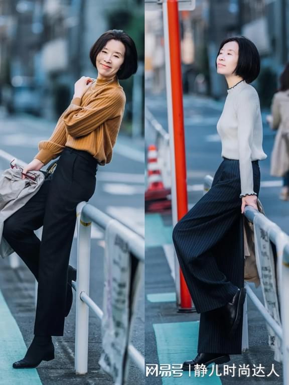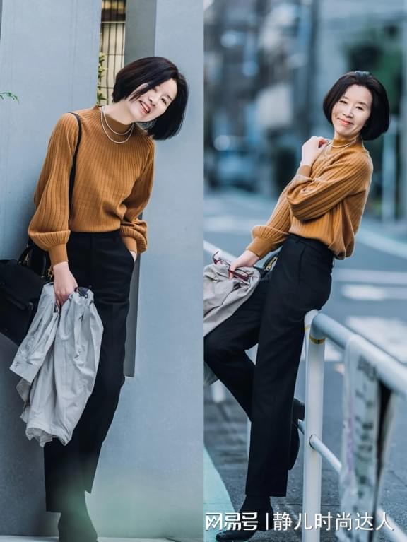 上短下长的搭配很适合中年女性,可以一定程度上改善你的比例,这种短针织衫塞进高腰裤,然后搭配时髦的短靴,轻轻松松就可以增高显腿长。