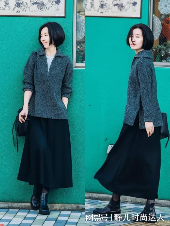毛呢外套或者是宽松的毛衣搭配过膝的半身裙,在保证搭配保暖性的同时,也可以带来很好的舒适感,而且这种灰色上衣和黑色半身裙的配色显得特别高级,不花哨不俗气,气质出众。