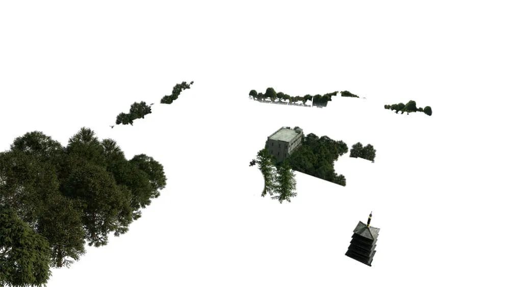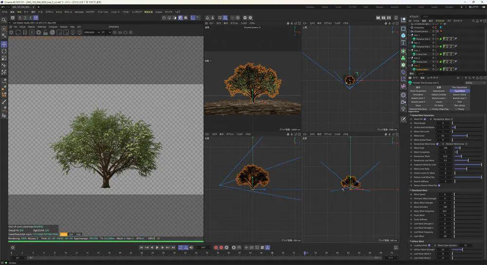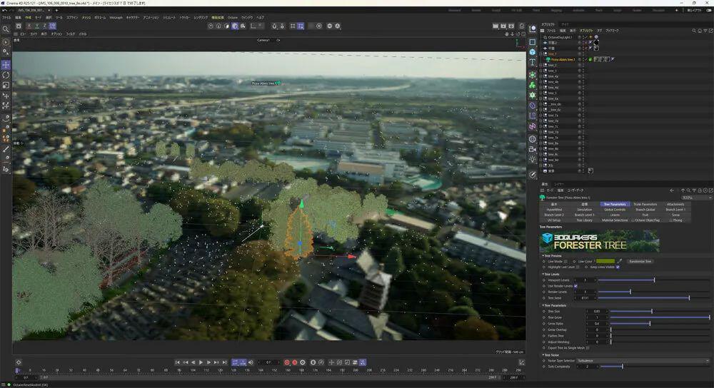 树木的制作则使用了C4D的植物插件Forester,来替换了原始画面中的树木。此外,Forester可以循环模拟风的运动,这样制作的树木在风中摇曳的效果可以作为通用素材在多个镜头中重复使用。