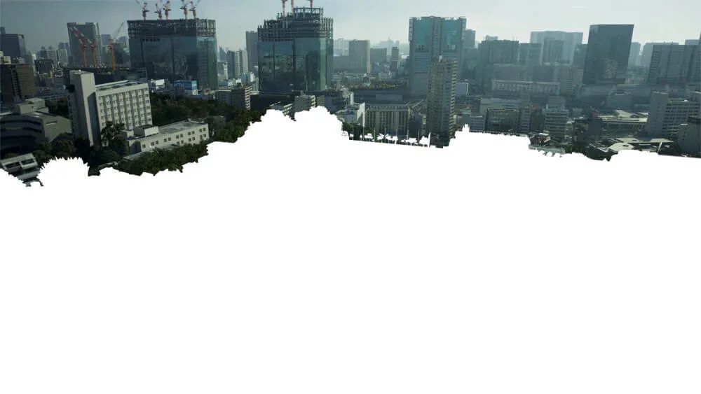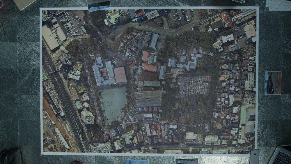剧中所有被地面师们盯上的土地都是通过合成镜头制作的。背景中品川的摩天大楼是用matte painting制作的;前景中出现的设施、茂密的树木、停车场的路灯以及地面的沥青都是使用CG创建的。