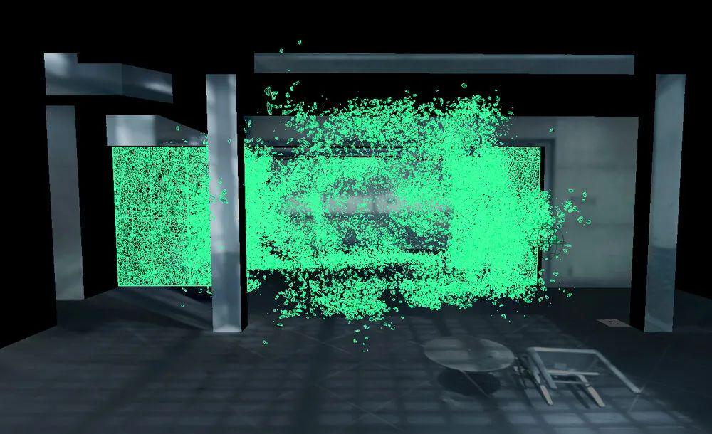 团队在CGSLAB的协助下对哈里森房间进行了高精度的3D扫描,基于扫描数据制作了飞散的玻璃和轻量化的背景模型,并投影了HDRI(高动态范围图像),以提高玻璃的反射精度。
