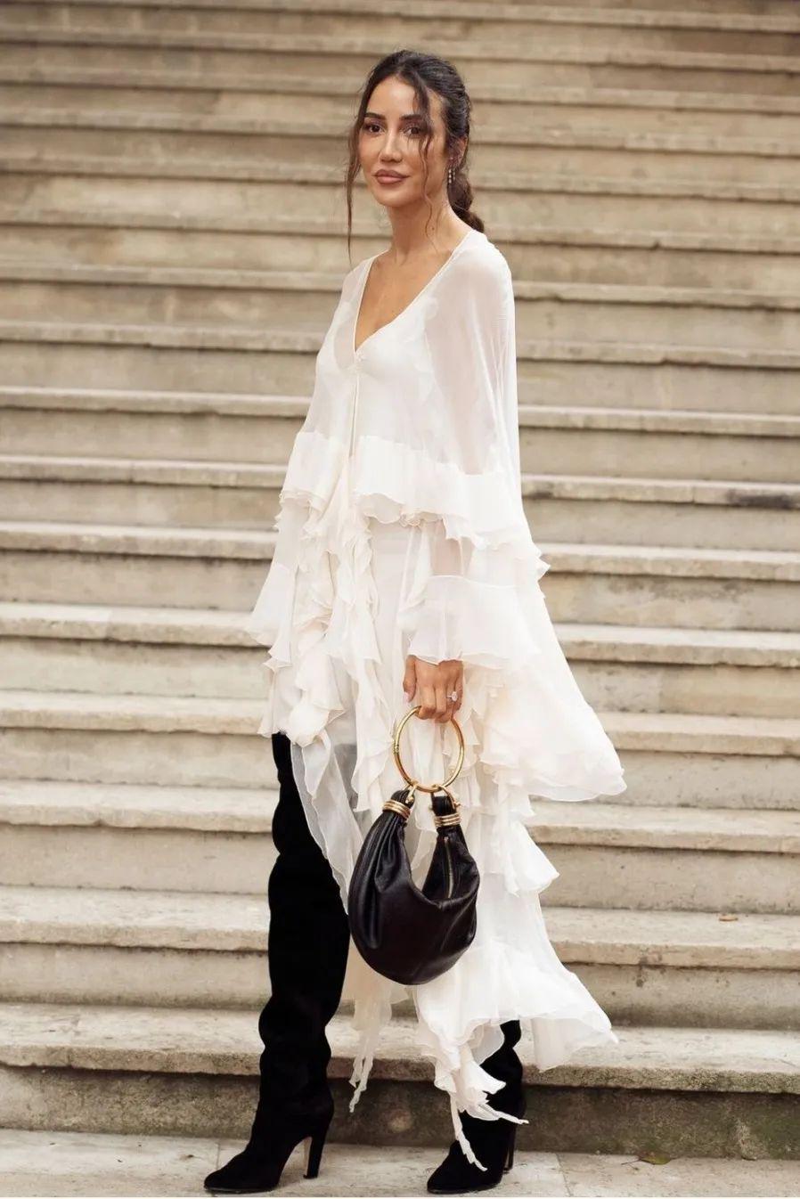 搭配针织连衣裙和长大衣,则为整体造型注入优雅与柔和的气质。