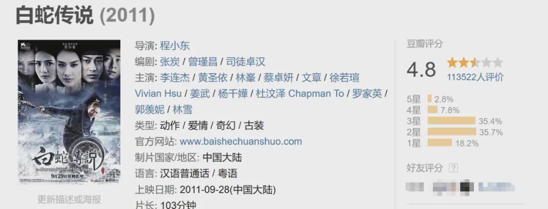 李连杰演法海,阿Sa蔡卓妍演小青,林峰演许仙,就连法海的小弟子,也是由当年还没“周一见”的文章出演。