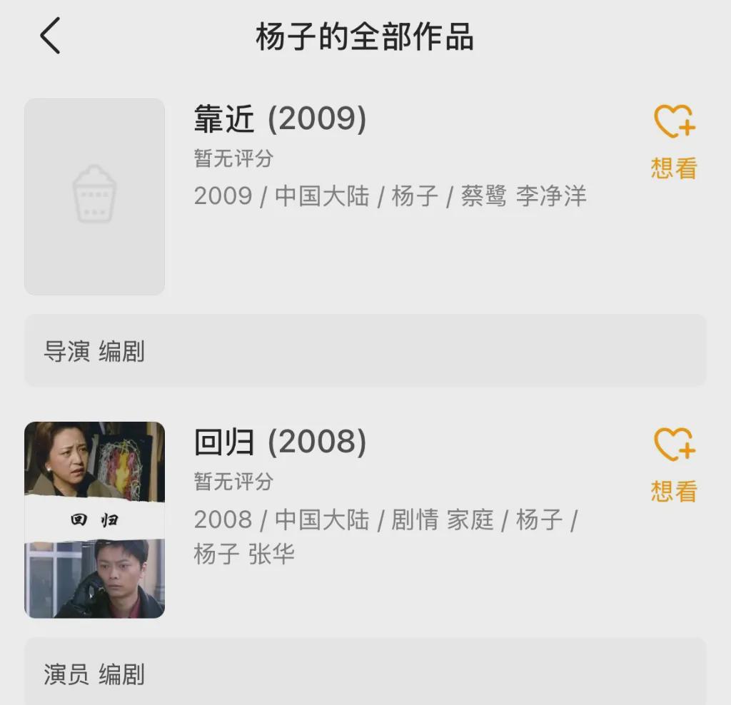 更离谱的是,杨子甚至还自编自导过几部戏,比如评分都没有的《靠近》和《回归》。