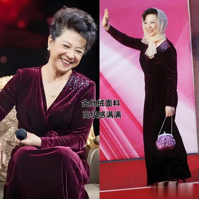 在这个年龄段,轻便舒适应该是她们考虑的首要因素,这一点王馥荔也是格外在意的,上面这条暗红色的连衣裙选用的就是做工精细、雍容华贵的金丝绒面料,穿上显得整个人贵气感满满。