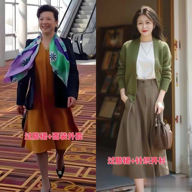 推荐穿法(1)过膝裙+西装、针织开衫,可飒爽可温柔