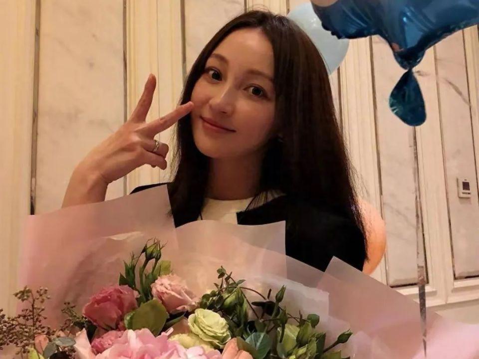 照片中的姚笛戴着钻戒,手捧玫瑰,脸上洋溢着幸福的笑容。