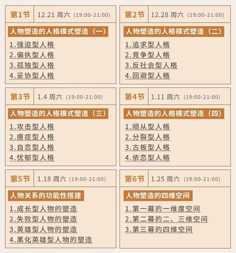 36天学习周期,6次直播课详细拆解,课程主讲导师韩佳彤,一一带你拆解包括强迫、偏执、攻击、自恋、回避、反社会在内等16种人格模式塑造,教你如何让笔下的人物立得住,让人物的过去和现在、人物性格的成因和脉络,都清晰可信可感。让观众共情沉浸在有完整因果的人物故事里,并且看见自己。