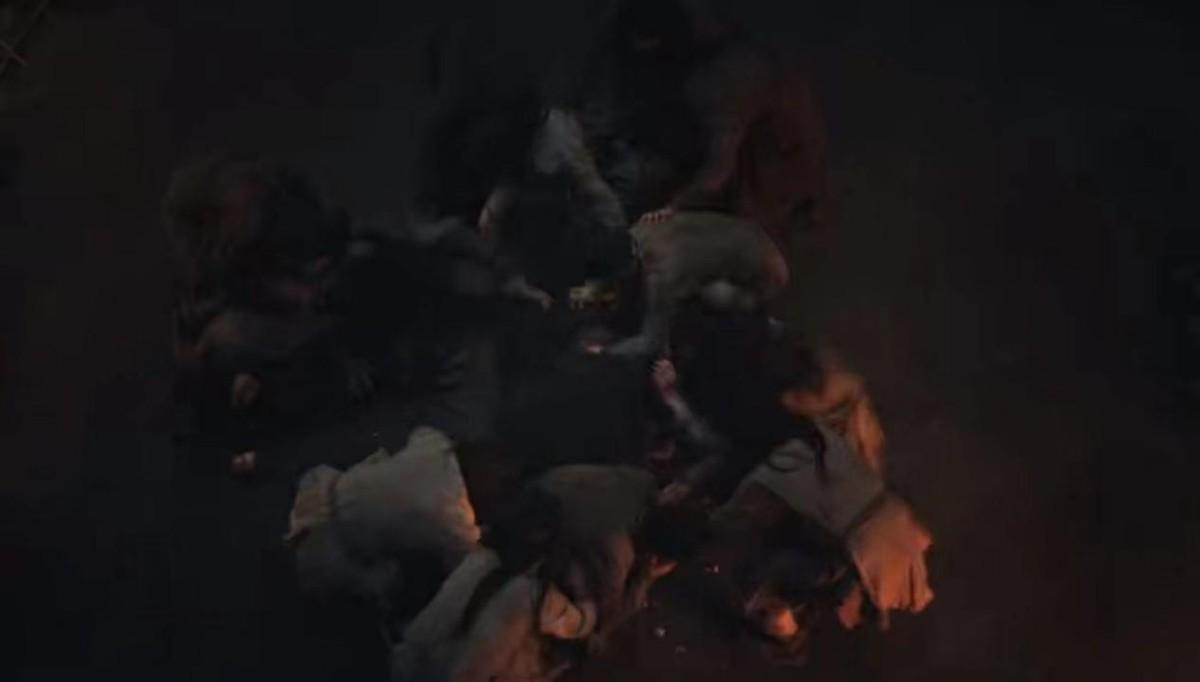 但镜头一转,阴暗的角落里,有人疯抢着地上的馒头,有人为了争一口吃的大打出手,还有人在这种环境的遮盖下挥刀杀人。