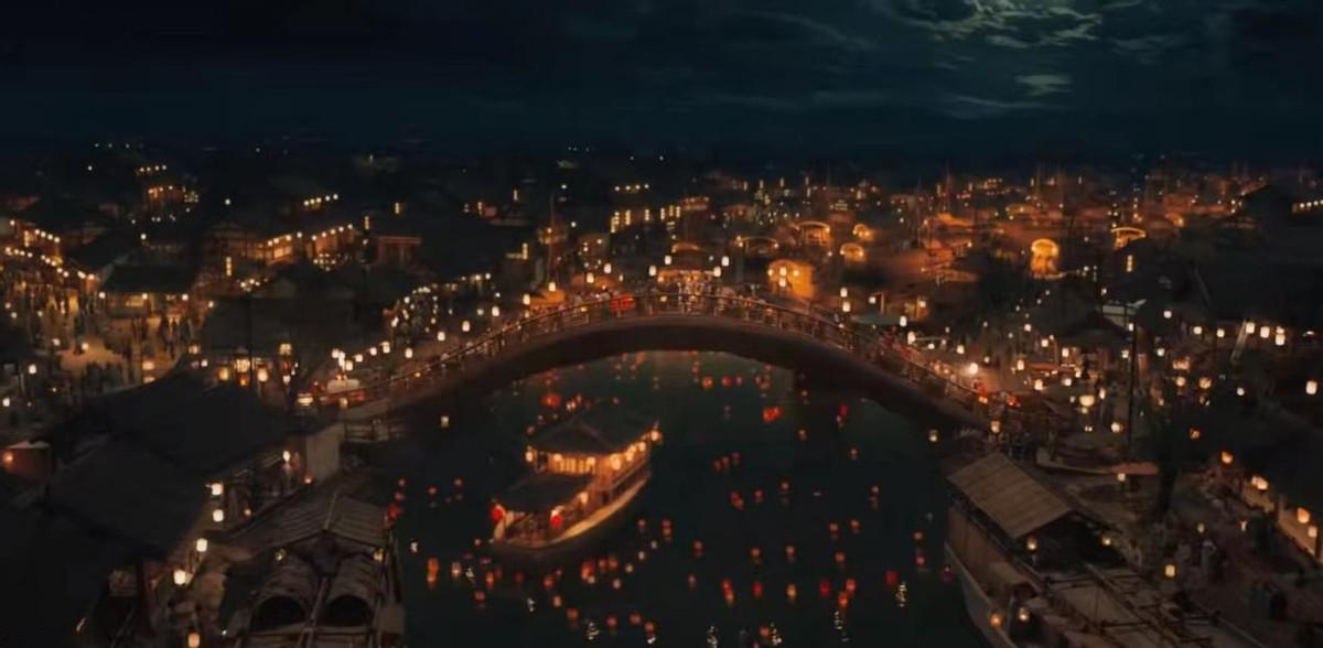 上一秒镜头对准的是北宋年间繁华的汴梁城夜景,到处张灯结彩,人来人往的桥上好不热闹,桥下是一艘灯火通明的船。