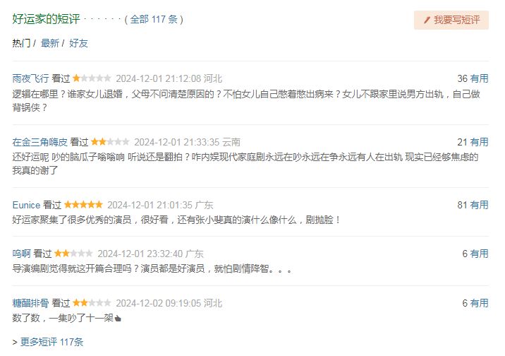 因为槽点太多,电视剧在豆瓣口碑扑的很惨烈,首页随机显示的5条热评,有四条都是差评。有网友直接点出剧情不合逻辑之处“逻辑在哪里?谁家女儿退婚,父母不问清楚原因的?不怕女儿自己憋着憋出病来?女儿不跟家里说男方出轨,自己做背锅侠?”还有网友吐槽“吵的脑瓜子嗡嗡响,现实已经够焦虑了现代家庭剧还永远在吵、永远有人在出轨。”以及有网友数了一下,发现“一集吵了十一架。”