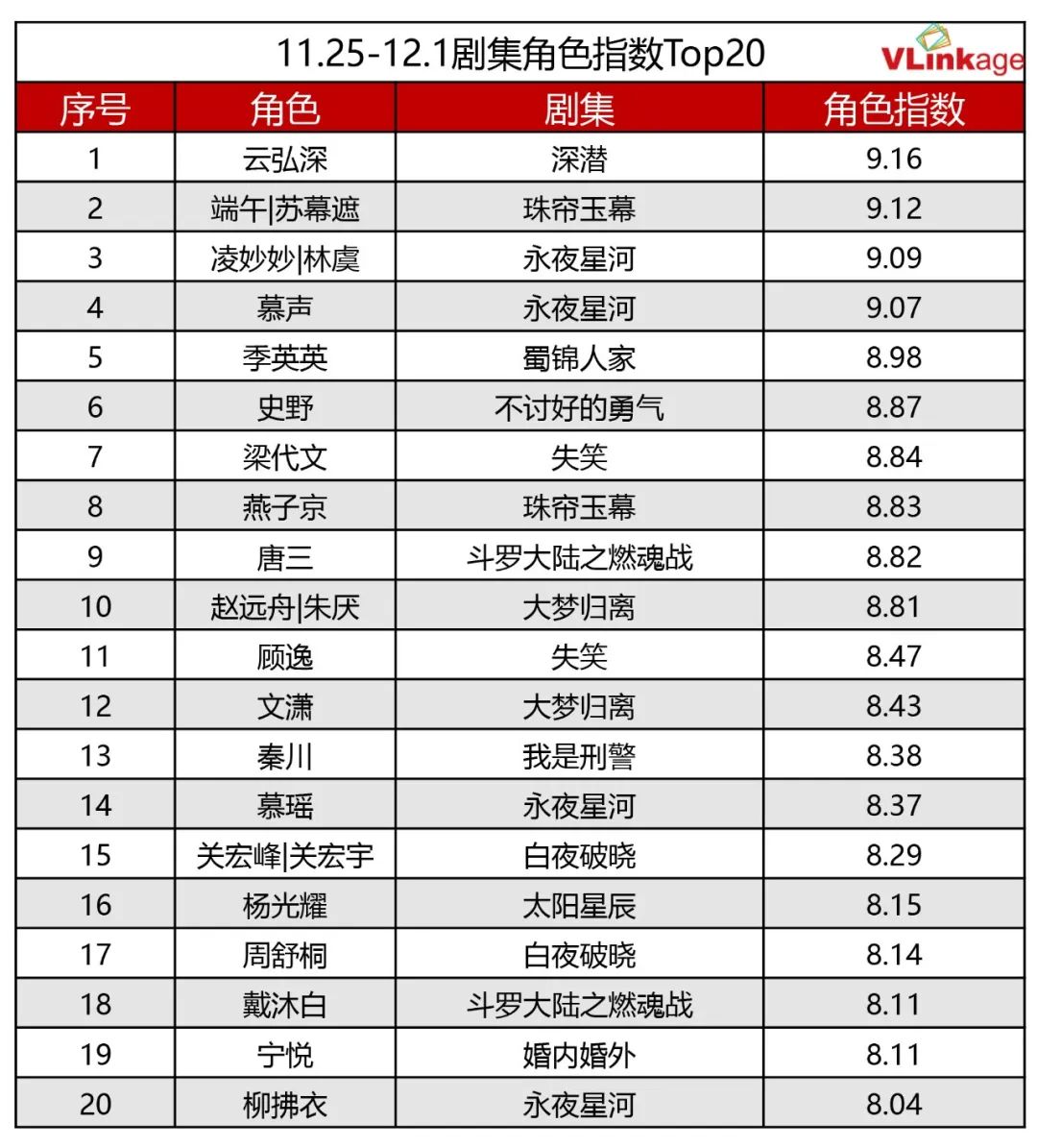 下图为上周剧集角色指数Top20,受众关注度最高的角色为谍战剧《深潜》男主云弘深。古偶剧《珠帘玉幕》女主端午,以及《永夜星河》的女主凌妙妙和男主慕声,同样在上周有着居高不下的高人气。