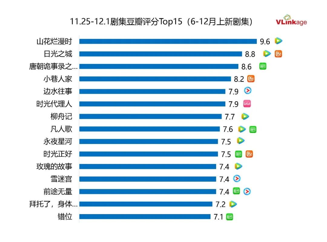 下图为上周6-12月剧集豆瓣评分Top15,口碑达到优异线的为《山花烂漫时》《日光之城》《唐朝诡事录之西行》和《小巷人家》。从11月底开始,被寄予高口碑厚望的悬疑赛道陆续上线不少新作,但截至目前,这些作品还没有高口碑开分。