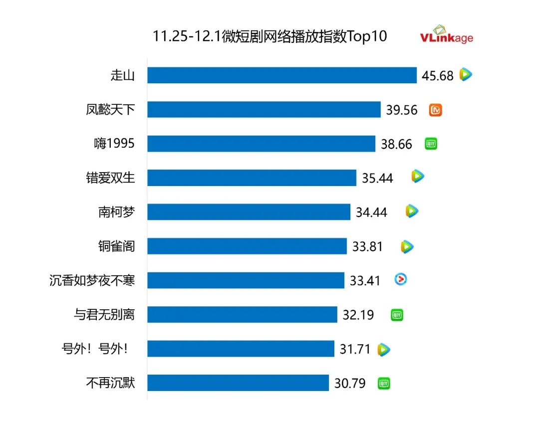 下图为上周微短剧网播指数Top10,网播指数在40+的仅有一部《走山》。新剧《凤懿天下》也表现不错,上线首周网播指数高达39.56,开播进入第二周的《嗨1995》也表现不俗,网播指数高达38.66。