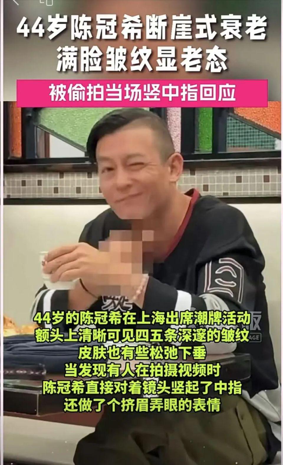 只见他脸上皱纹明显,看上去甚是劳累,当发现网友后,陈冠希对着镜头竖起了中指,还做了个挤眉弄眼的表情,其气质直逼。