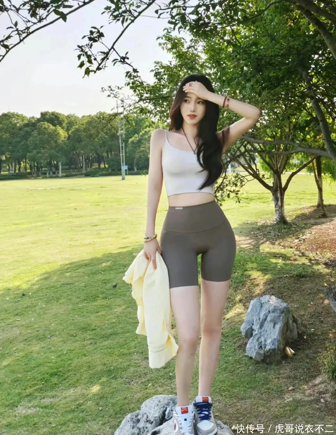 搭配亮点:为了增加层次感和时尚度,可以在外搭一件轻薄的防晒开衫或牛仔外套,既防晒又能根据天气变化灵活穿脱。鞋子方面,推荐搭配一双舒适的运动鞋或凉鞋,既符合整体的运动风格,又能保证长时间行走的舒适度。