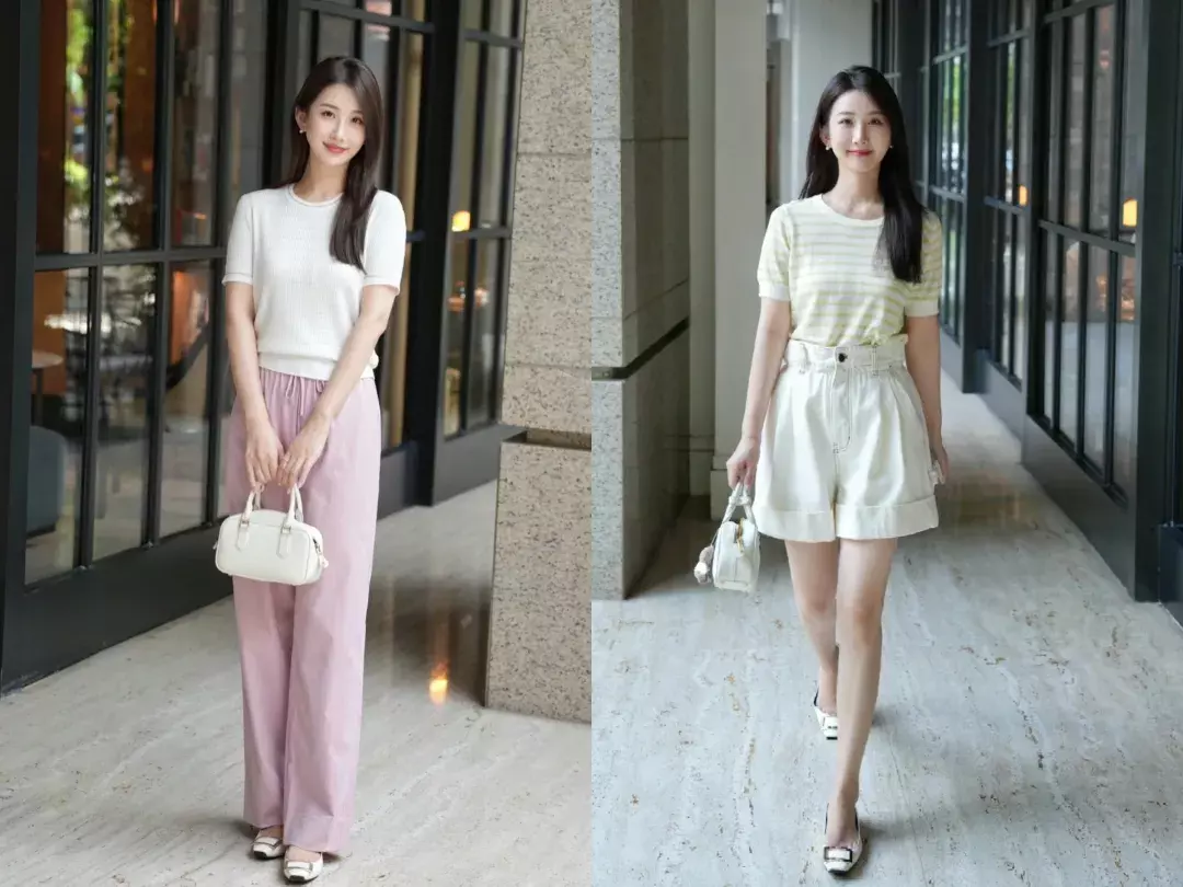 我们可以选择高腰款的阔腿裤搭配修身的短上衣,打造上紧下松的穿搭,有效衬托出咱们中年女性的曲线美。