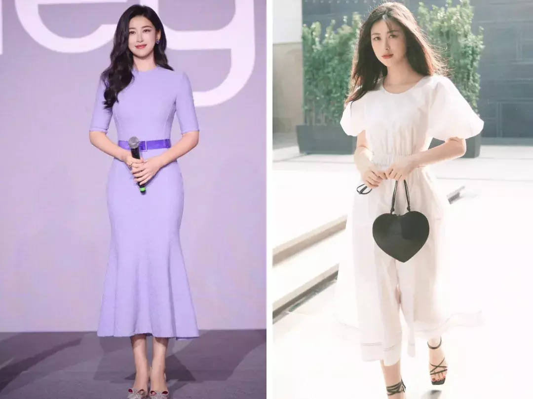 不信你看上图,她们一个人选择了枣红色的收腰连衣裙搭配白色高跟鞋,一个选择淡粉色收腰连衣裙搭配银色高跟鞋,各有各的美。