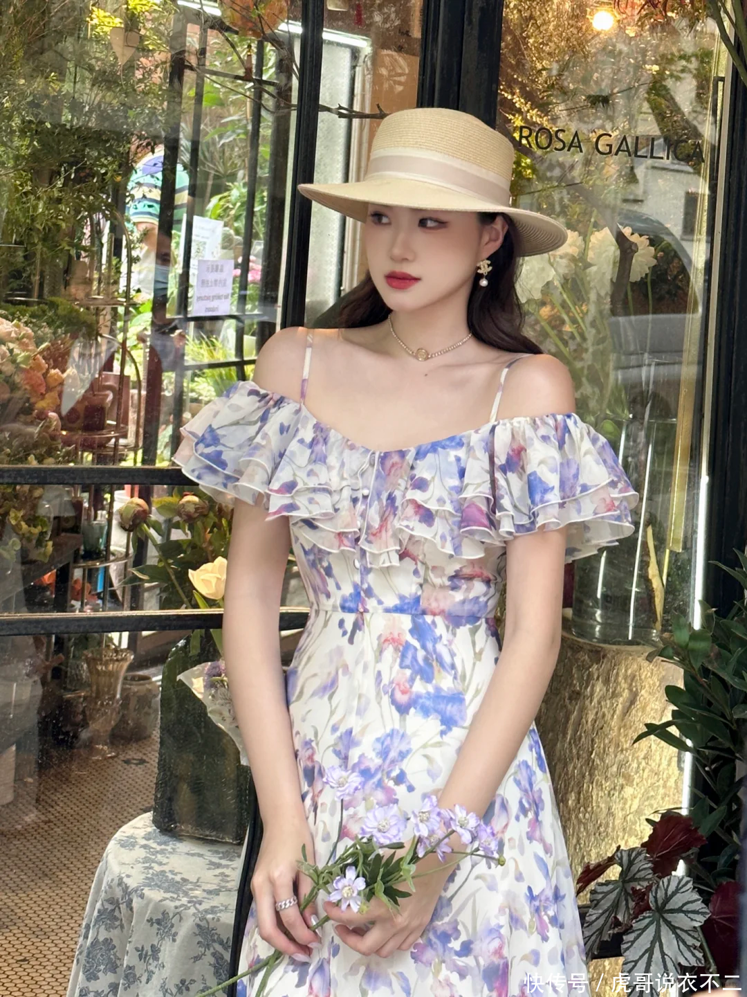 穿搭案例:一字肩设计总能恰到好处地展现女性的优雅与性感,它不仅能够修饰颈部线条,还能让锁骨成为视觉焦点。选择一款剪裁合身、面料轻盈的一字肩连衣裙,无论是纯色还是带有小碎花图案,都能让你在人群中脱颖而出。