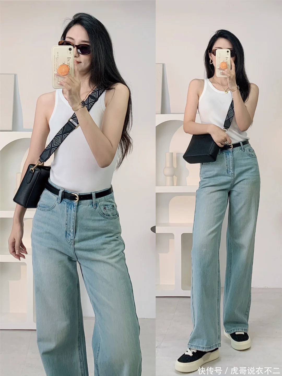 穿搭亮点:牛仔,作为永不过时的时尚元素,即便是在炎炎夏日,也能以它独有的魅力征服人心。高腰设计的牛仔阔腿裤,不仅能够提升腰线,拉长腿部线条,还能有效遮盖腹部赘肉,是梨形身材妹子的福音。搭配上一件纯色吊带背心,简约而不失性感,完美展现锁骨与肩颈线条,让夏日风情呼之欲出。