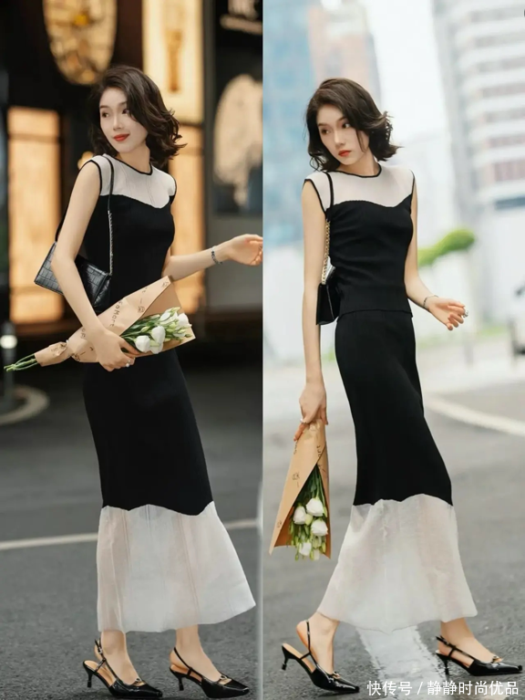 配色简洁也是穿出高级感的重点,比如黑白拼色的连衣裙搭配起来就会显示出一种清新脱俗的美感,看起来简约大方,鞋子的颜色和连衣裙呼应也可以加强层次感,避免单品组合显得繁琐。