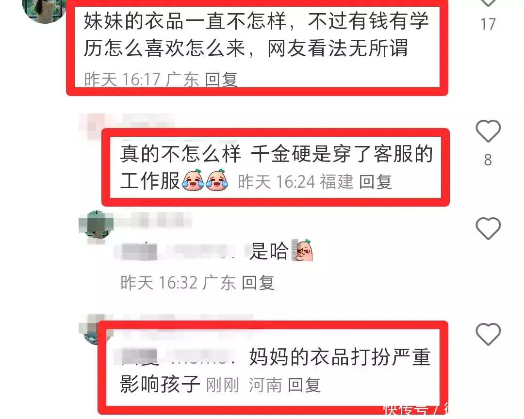 有网友表示何超欣的穿搭风格随妈妈梁安琪,虽然漂亮但穿搭方面却是一言难尽,在穿搭方面她确实需要和嫂子学学了。