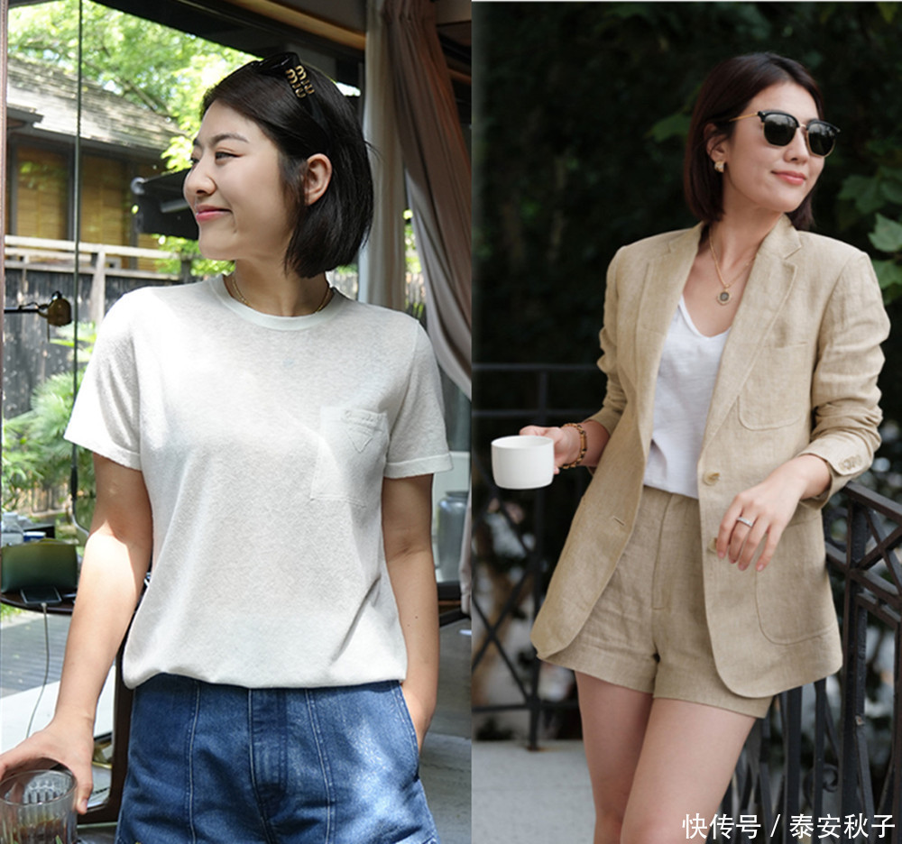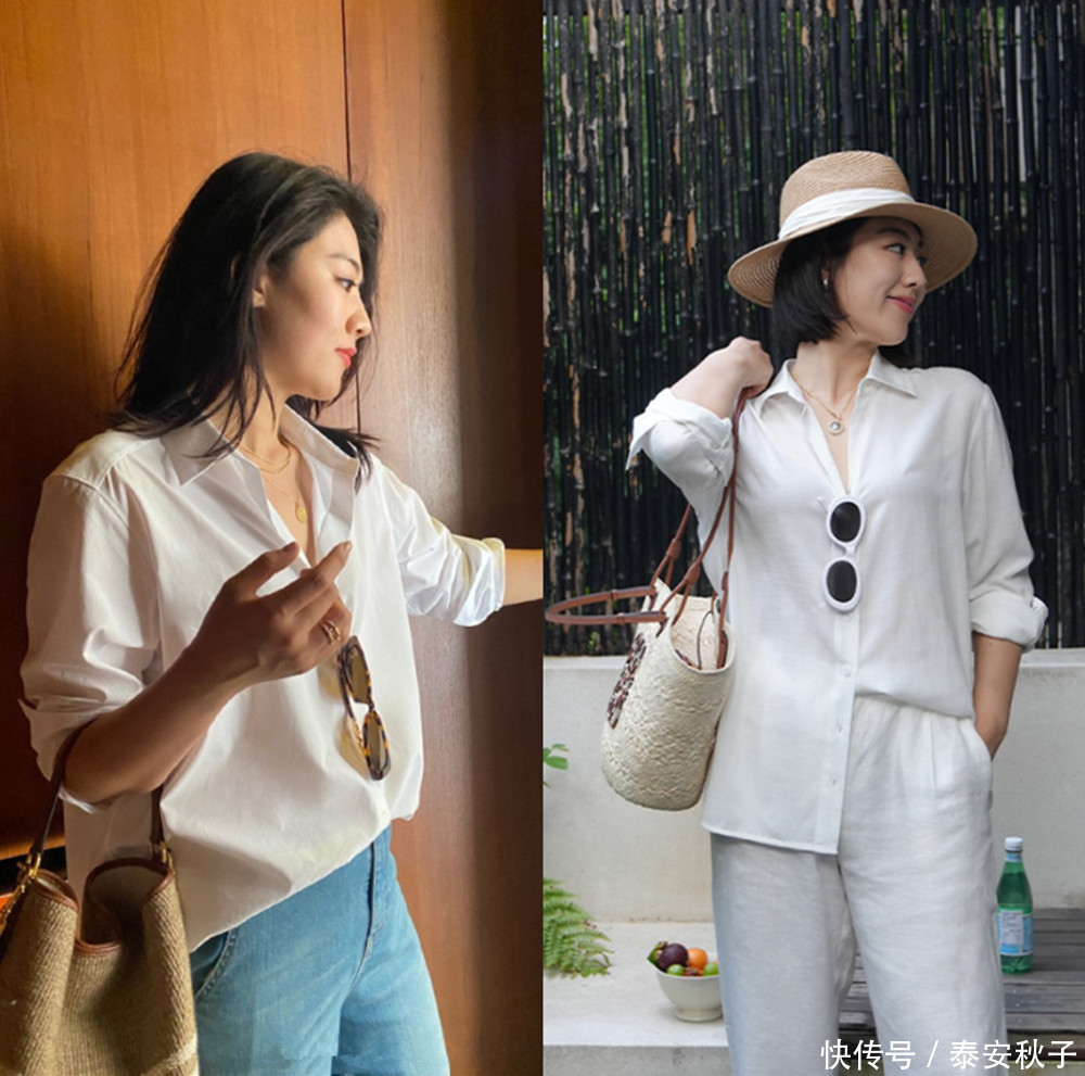 尤其是这种亚麻、苎麻、或者是棉麻的宽松衬衫,挽起衣袖、解开领口,随意一搭就可以满足休闲、通勤风的穿衣需求。
